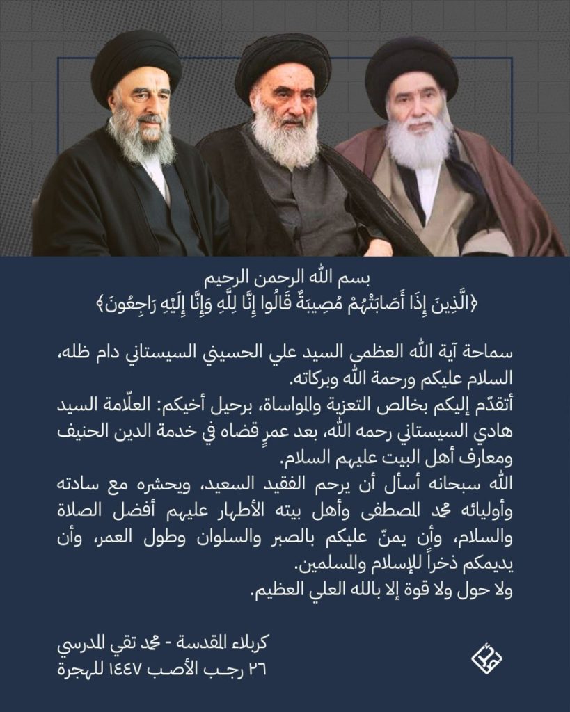 25 يناير, 2026برقية تعزية من سماحة السيد المرجع المدرسي دام ظله الى سماحة السيد المرجع السيستاني دام ظله بوفاة اخيه.