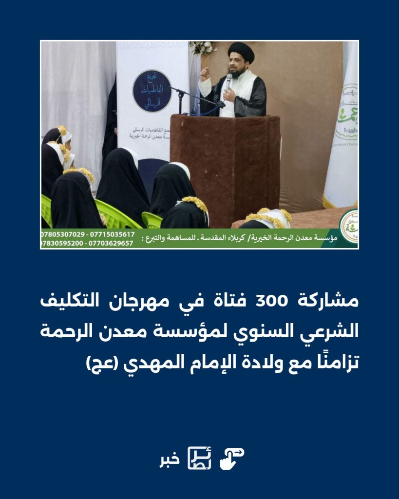 4 فبراير, 2026مشاركة 300 فتاة في مهرجان التكليف الشرعي السنوي لمؤسسة معدن الرحمة تزامنًا مع ولادة الإمام المهدي (عج)